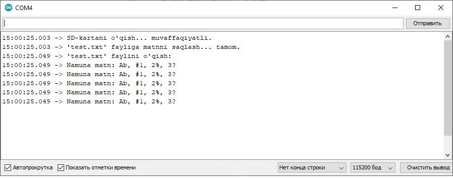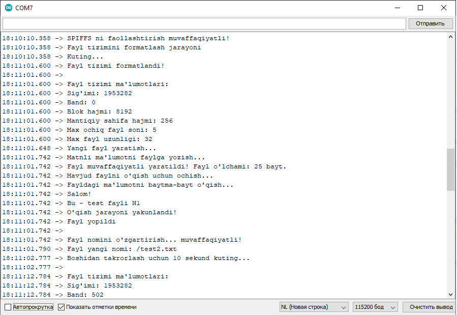 1-misol. Ushbu misolda mikrokontroller xotirasining fayl tizimi uchun ajratilgan qismida fayllar ustidagi asosiy operatsiyalarni bajarilish, natijalarni port monitorida ko’rsatib borish sketchini ko’rib chiqamiz. Xususan, quyidagi operatsiyalar bajariladi va natijasi portga chiqariladi: