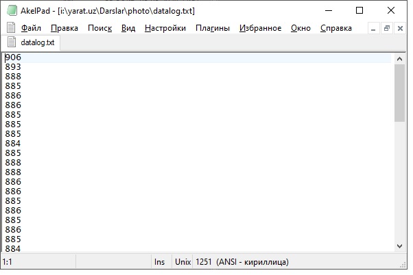 2-skrinshot (“datalog.txt” fayliga saqlangan datchik ko’rsatkichlari):