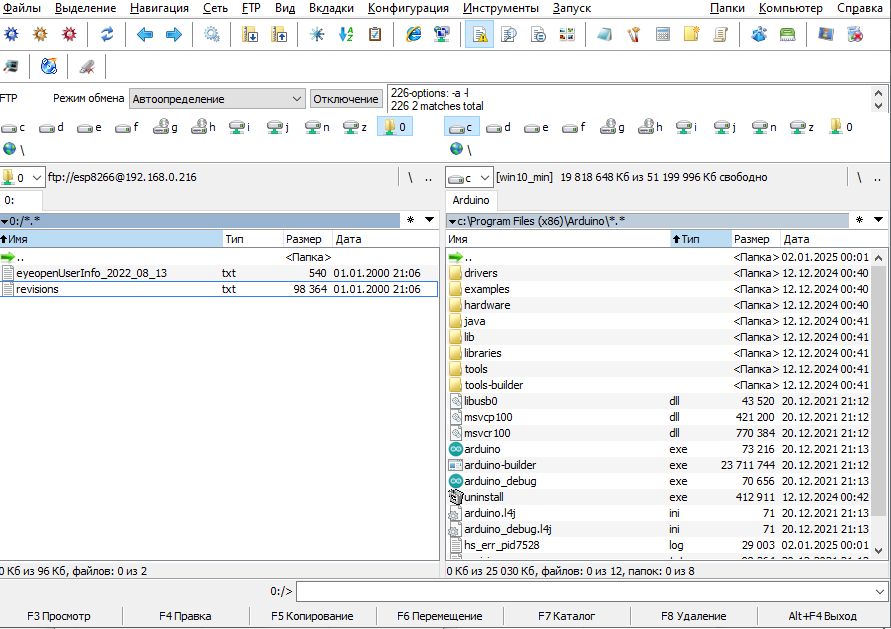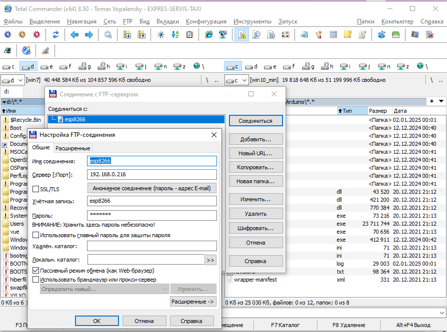 Kompyuterda Windows uchun “Total Commander” dasturini ishga tushirib, “FTP” menyusi “Соединиться с FTP-сервером…” buyrug’ini tanlaymiz va yangi bog’lanish parametrlarini (server IP-manzili, foydalanuvchi logini va parolini) quyidagi rasmdagi kabi kiritamiz. Asosiy parametrlar (bog’lanish nomidan tashqari) sketchda ko’rsatilganlari bilan bir xil bo’lishi kerak.