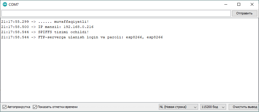 2-misol. Ushbu misolda mikrokontrollerning SPIFFS fayl tizimi bilan ishlash uchun sketch yordamida FTP-server hosil qilamiz hamda ayrim FTP-mijoz ilovalaridan foydalanganib unga bog’lanish jarayonini ko’rib chiqamiz. Buning uchun “ESP8266FtpServer.h” bibliotekasi yordamida yaratilgan “FTPServerSample” namunaviy sketchini ochib, o’zimizga moslashtiramiz (ushbu sketch ESP8266 va ESP32 platalariga moslashtirilgan).