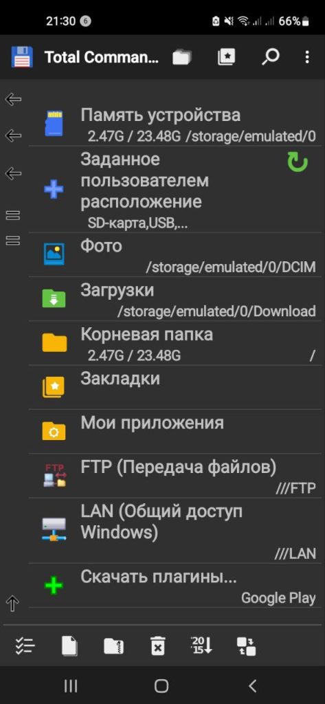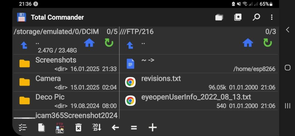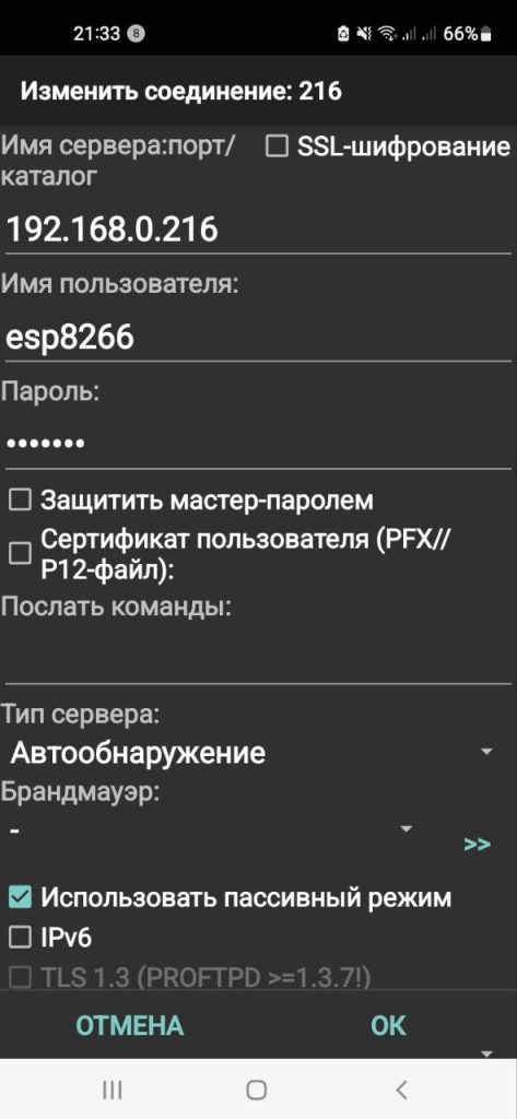 Smartfonda esa, “Total Commander” mobil ilovasi ishga tushirilgach asosiy papkada “FTP (Передача файлов)”, keyin “Создать соединение…” buyruqlari yordamida yangi FTP-bog’lanish parametrlarini (ixtiyoriy sarlavha, IP-manzil, login, parol, passiv rejim) o’rnatamiz.