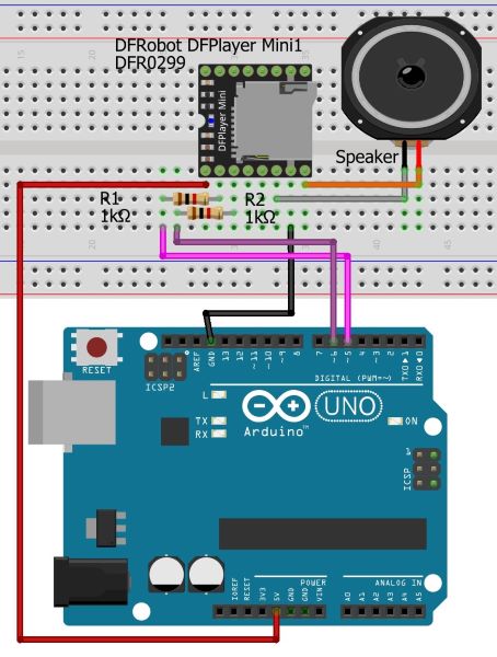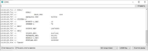 5-misol. Endigi misolda “DFPlayer mini” nomli MP3/WMA/WAV audiopleyer moduli yordamida turli xil formatlardagi tovush fayllarini eshittirish uchun mo’ljallangan namunaviy “GetStarted” sketchini ko’rib chiqamiz. Sketch “DFPlayer mini” ga o’rnatilgan MicroSD-kartadagi barcha audiofayllarning har birini navbat bilan 10 sekunddan eshittirishga mo’ljallangan. Ro’yxat tugagach, yana boshidan boshlanadi.