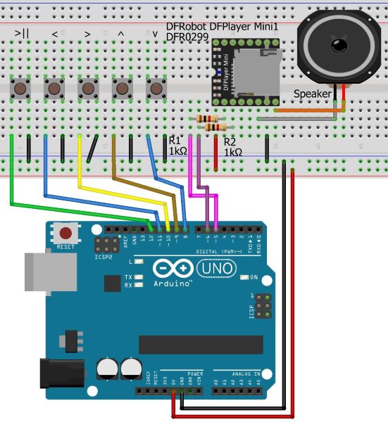Yuqoridagi 5-sketchni takomillashtirib, MP3-pleyer yarating. Ya’ni, uni “DFPlayer mini” moduliga o’rnatilgan MicroSD-kartadagi audiofayllarni tugmalar yordamida eshittirish, ularni tanlash, tovush balandligini regulirovka qilishga moslashtiring. Sxema taxminan quyidagi ko’rinishda bo’lishi kerak: