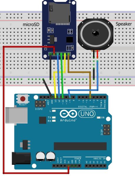 4-misol. Navbatdagi bosqichda Arduino UNO platasi yordamida SD-kartada joylashgan “WAV” formatidagi musiqa faylini plataga ulangan spiker (dinamik) orqali eshittirish jarayonini ko’rib chiqamiz. Buning uchun yuqoridagi bibliotekalardan tashqari, “wav” formatli tovush fayllari bilan ishlovchi “TMRpcm.h” bibliotekasidan foydalanamiz (bibliotekadan faqat AVR arxitekturali mikrokontrollerlarda foydalanish mumkin. Boshqa mikrokontrollerlar uchun tegishli bibliotekalardan foydalanishga to’g’ri keladi. Masalan, ESP32-S3 platalari uchun maxsus biblioteka yordamida MP3-pleyer yoki Internet-radio loyihalarini ham yaratish mumkin. Biroq, bunday loyihalar bilan ishlashni o’quvchilarning ixtiyoriga qoldiramiz).