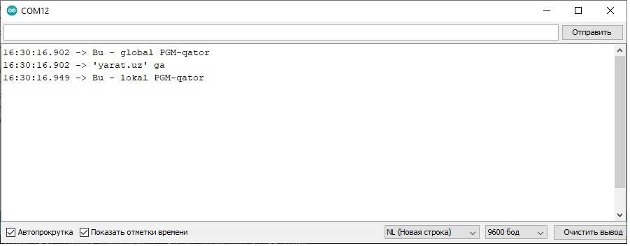 Eslatma. Bibliotekalardagi ayrim funksiyalar (masalan, ESP8266 bibliotekasi) PGM-qatorlar bilan ishlay oladi. Bu imkoniyatdan ham dasturlash paytida foydalanish mumkin.