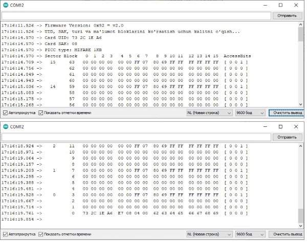 1-misol. Dastlab RFID-kalitni va undagi ma’lumotlarni o’qish uchun bibliotekaning “Dumpinfo” namunaviy sketchidan foydalanamiz. Keyinchalik Arduino yuklamasini RFID yordamida boshqarish uchun ko’p hollarda kalitning UID kodini aniqlashning o’zi yetarli bo’ladi. Bunday kod kalitni modulga yaqinlashtirgan zahoti ko’rsatiladi. RFID-kalitdagi batafsil ma’lumotlarni olish uchun esa, kalitni oxirgi ma’lumot ko’rsatilgunga qadar moduldan uzoqlashtirmasdan ushlab turilishi kerak, aksincha xatolik yuz bergani haqidagi “Timeout in communication” yozuvi ko’rsatiladi.