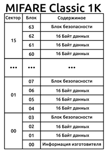 MIFARE protokolidagi “MIFARE Classic 1K” kaliti xotirasi quyidagi strukturaga ega bo’ladi: