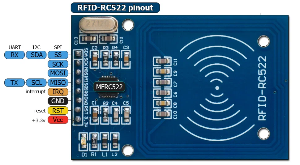 | MFRC522 | Arduino Uno | Arduino Mega | Arduino Nano v3 | Arduino Leonardo/Micro | Arduino Pro Micro |