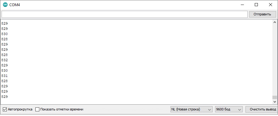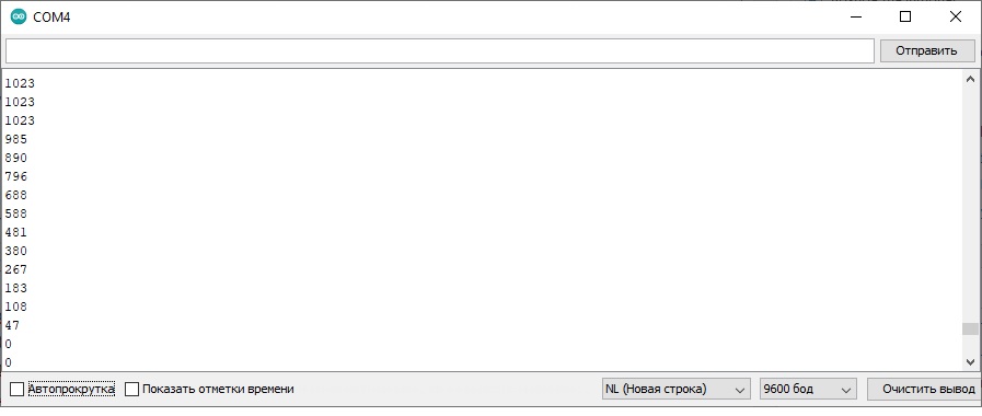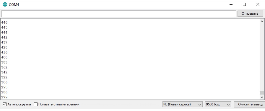 Sketch yuklanganidan so’ng, port monitorini ochsak, hududdagi yorug’likdan kelib chiqib, port monitorida sonlar o’zgarayotganini kuzatish mumkin (3-rasm). Ushbu o’zgarishni yanada vizuallashtirish uchun, natijalarni plotterda kuzatishimiz mumkin (4-rasm).