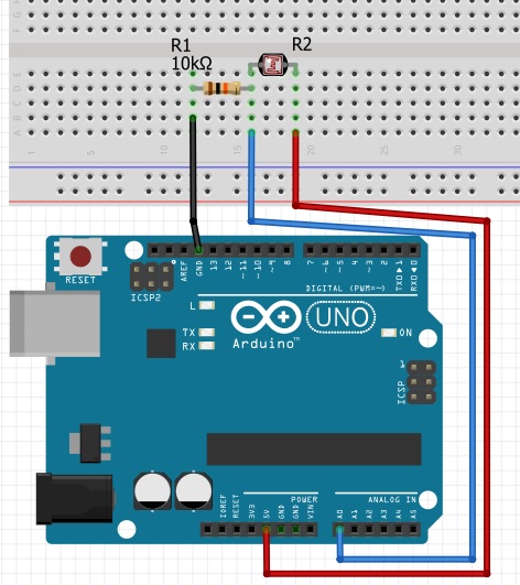 Sxemadagi R1 rezistor, R2 fotorezistor bilan birgalikda kuchlanishni bo’lgich vazifasini bajaradi. Ulardan biri musbat qutbga (+5V), ikkinchisi manfiy qutbga (GND), o’zaro birlashgan umumiy kontakt esa, Arduino UNO ning A0 piniga ulangan.