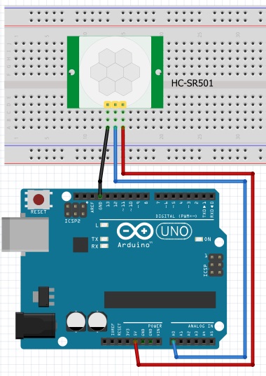 5-variant. HC-SR501 infraqizil harakat detektorini A0 analog piniga ulaymiz (ushbu detektorni analog datchik sifatida analog pinga ham, raqamli datchik sifatida raqamli pinga ham ulash mumkin, chunki harakat sezilganda detektor chiqish kontaktida yuqori signal hosil qiladi, kutish rejimida yana chiqish pinida LOW signali hosil bo’ladi).