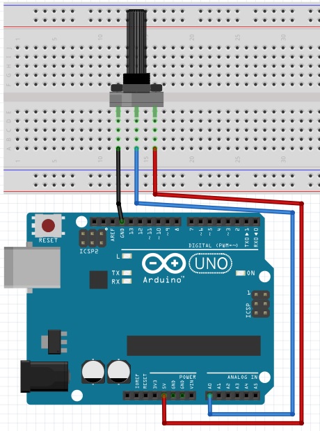 2-variant. Dastlab, qulaylik uchun maksimal qarshiligi 10 kOm bo’lgan potensiometr (o’zgaruvchan rezistor)ni plataga quyidagi sxemaga asosan ulaymiz (o’rtadagi kontakt A0 piniga, qolgan kontaktlar +5V va GND pinlariga ulanadi. Shu yo’l bilan potensiometr yordamida “kuchlanish bo’lgichi” (“делитель напряжения”) hosil qilinadi. Chetki kontaktlar o’rni almashsa, qarshilik qiymati o’zgarishi yo’nalishi qarama-qarshisiga almashadi). Potensiometrning o’rtadagi kontakti regulirovka natijasida Arduinoning +5V va GND (0V) qutblari orasidagi oraliq kuchlanishni tanlash vazifasini bajaradi. Shu kuchlanishga mos qiymat esa, A0 pinida hosil bo’ladi.