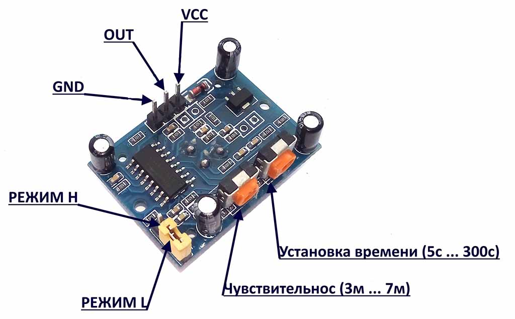 Datchikning chetida 2 ta o’zgaruvchan rezistor o’rnatilgan bo’lib, ulardan biri (plataning o’rtarog’ida joylashgan) detektorning sezgirligini (3-7 metr), 2-chisi HIGH chiqish signalini ushlab turish vaqtini (5-300 sekund) sozlash uchun ishlatiladi. Platadagi “H”, “L” rejimlari uyasi detektor yuklamani ulagan paytda ham harakatni sezishni davom ettirishi (“H” rejimi) yoki harakat sezilishidan qat’iy nazar yuklamani belgilangan vaqtda uzishi (“L” rejimi) uchun tanlanadi.