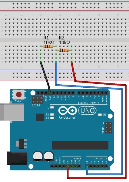 1-variant. Dastlab, o’zgarmas qarshilikka ega bo’lgan rezistorlarni qulaylik uchun plataga quyidagi sxemaga (kuchlanishni bo’lgich sxemasiga) asosan ulaymiz. Shu yo’l bilan rezistorlarning qiymatiga qarab, A0 piniga kiruvchi kuchlanish cheklanadi va unga mos raqamlashgan qiymat hosil qilinadi. Turli qarshilikka ega bo’lgan rezistorlar uchun turli raqamlashgan qiymatlar to’g’ri keladi va ular 0 dan 1023 gacha oraliqda bo’ladi.