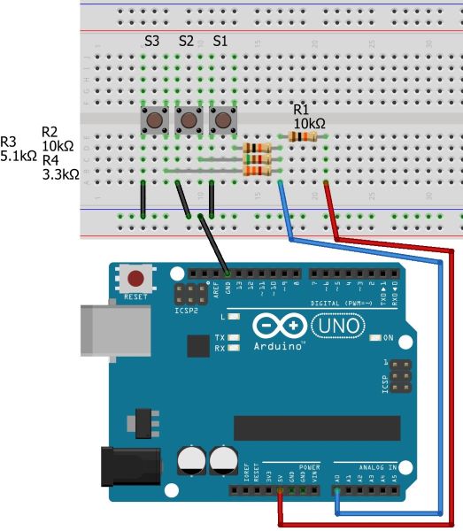 Yuqoridagi sxema hech qanday amaliy loyihalarda qo’llanilmasligi mumkin. Lekin, qarshiligi turlicha bo’lgan bir nechta rezistorlarni qo’llab va ularga bir nechta tugmalarni ketma-ket ulab, amaliy hamiyatga ega bo’lgan ko’plab loyihalarni yaratish mumkin. Ya’ni, bunda har xil tugma bosilishi natijasida, analog pinda ham shunga mos turli darajadagi signallar hosil bo’lishiga e’tibor beriladi. Bundan tashqari, ayrim tugmalarni baravar bosib ham, natijaviy qarshilik qiymatini pasaytirib, yana boshqa raqamlashgan ko’rsatkichlarni olish mumkin.