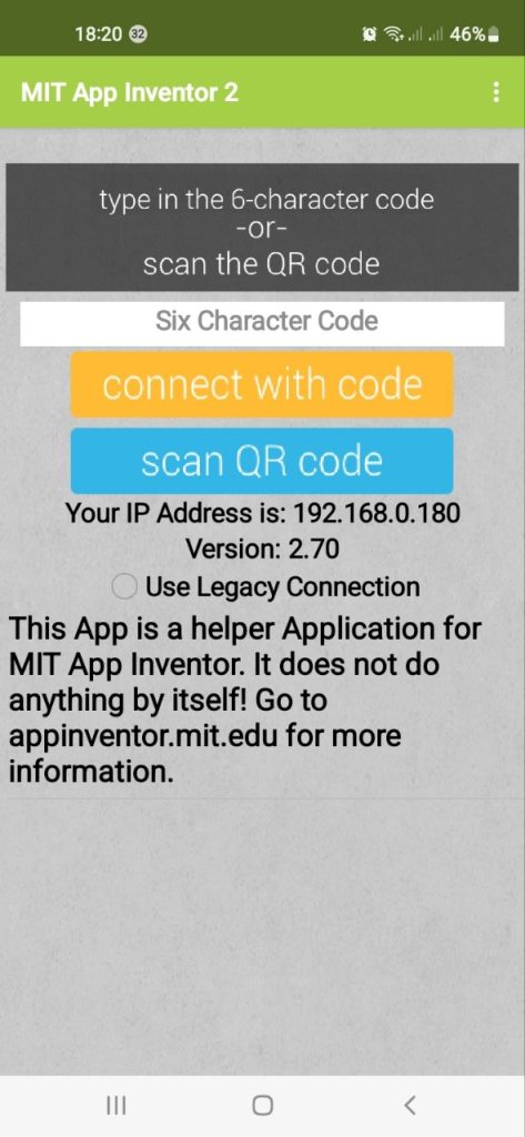 Shundan keyin MIT AI ning “Подключиться” menyusidagi “Помощник AI” elementi tanlansa, sahifada vaqtinchalik QR-kod va unga mos matnli kodni o’z ichiga olgan kichik oyna hosil bo’ladi. “MIT AI2 Companion” ilovasidagi matn maydoniga ushbu matnli kod kiritilib “connect with code” tugmasi bosilsa yoki ilova oynasidagi “scan QR code” tugmasini bosib, MIT AI oynasidagi QR-kod skanerlansa, Internet orqali ikki tomonlama aloqa o’rnatiladi. Aloqa faol bo’lgan paytda MIT AI akkauntidagi dasturga kiritilgan har qanday o’zgarishni smartfonda onlayn ravishda kuzatib borish mumkin bo’ladi!