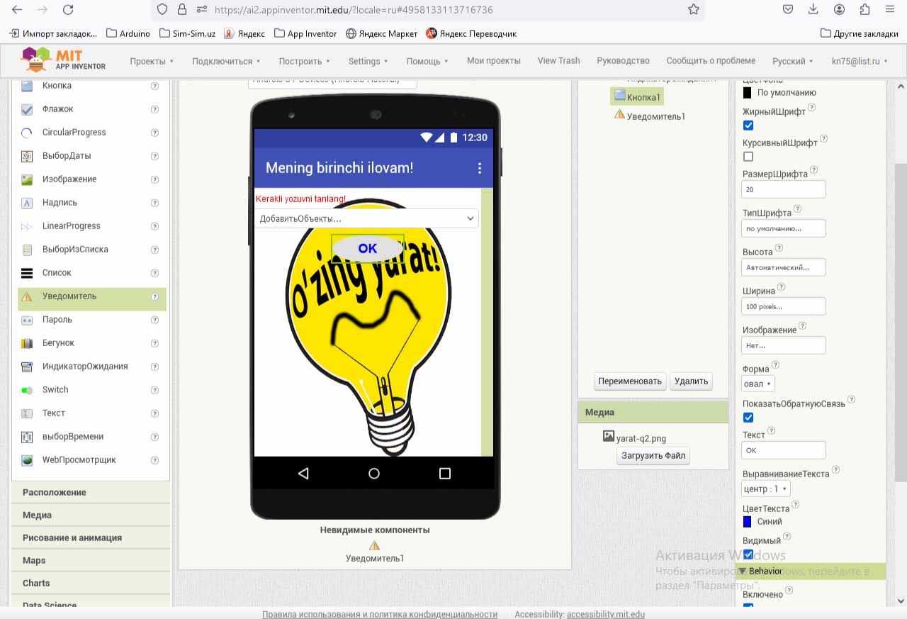 Loyiha nomini ko’rsatib, “OK” ni bosamiz. Yangi loyiha oynasi paydo bo’lgach, o’ng tomondagi komponentlar ro’yxatida Screen1 komponenti paydo bo’ladi. O’ng tomondagi “Свойства” bo’limida uning ayrim xususiyatlarini o’zgartiramiz. Bunimg uchun kerakli maydonlar qiymatini o’zgartiramiz. Masalan, “ФоновыйРисунок” maydoniga kompyuterdan ixtiyoriy rasm faylini tanlaymiz, “Заголовок” maydoniga misol tariqasida ilova sarlavhasini (masalan, “Mening birinchi ilovam!” matnini) kiritamiz. Boshqa maydonlarni o’zgartirmaymiz. Tanlangan rasm fayli nomi komponentlar ro’yxati quyirog’idagi “Медиа” ro’yxatida ham ko’rinadi.