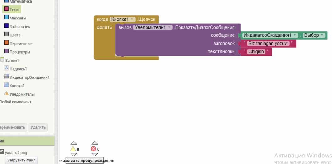 “когда Кнопка1.Щелчок” bloki “Screen1/Кнопка1” bo’limida joylashgan;