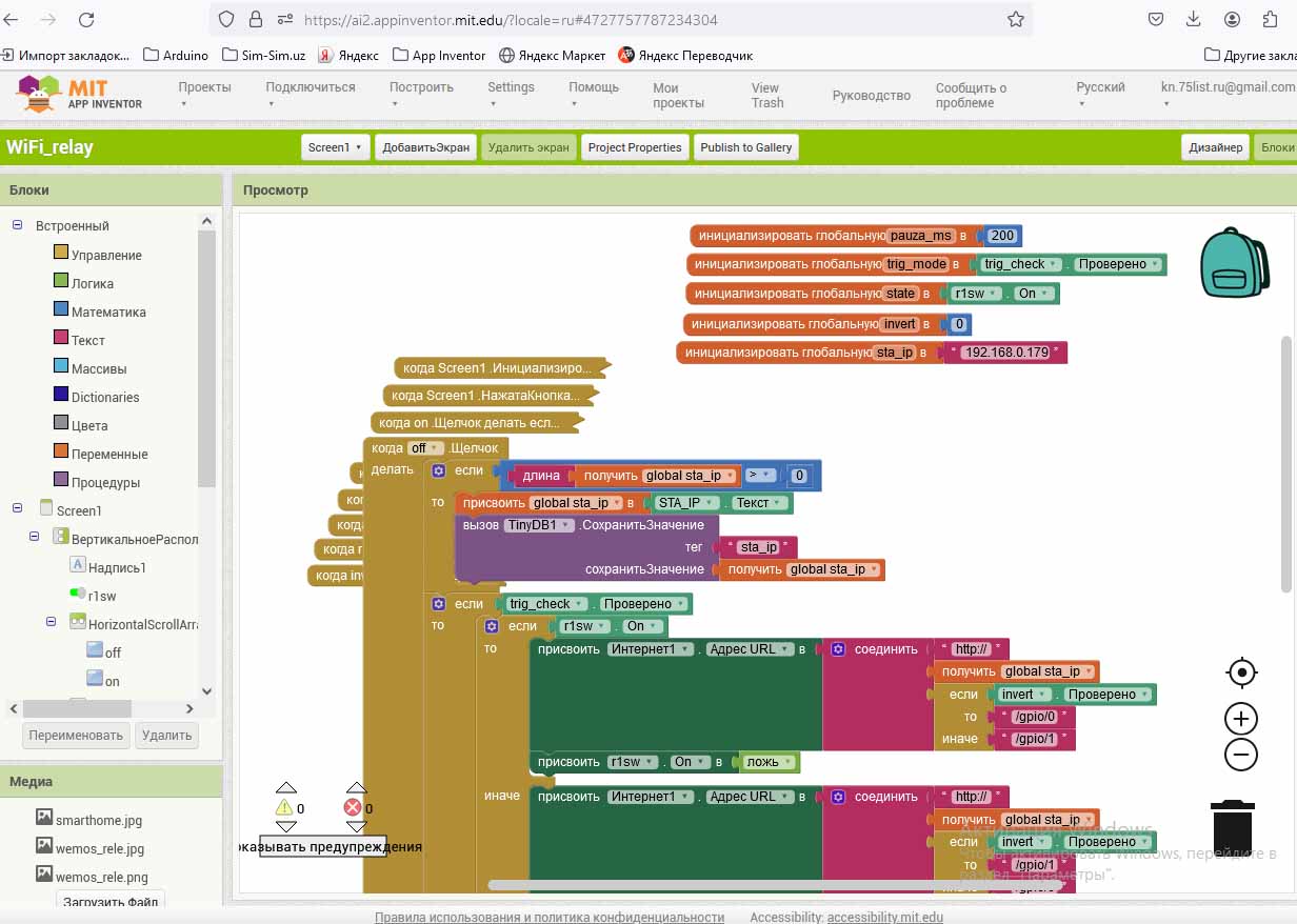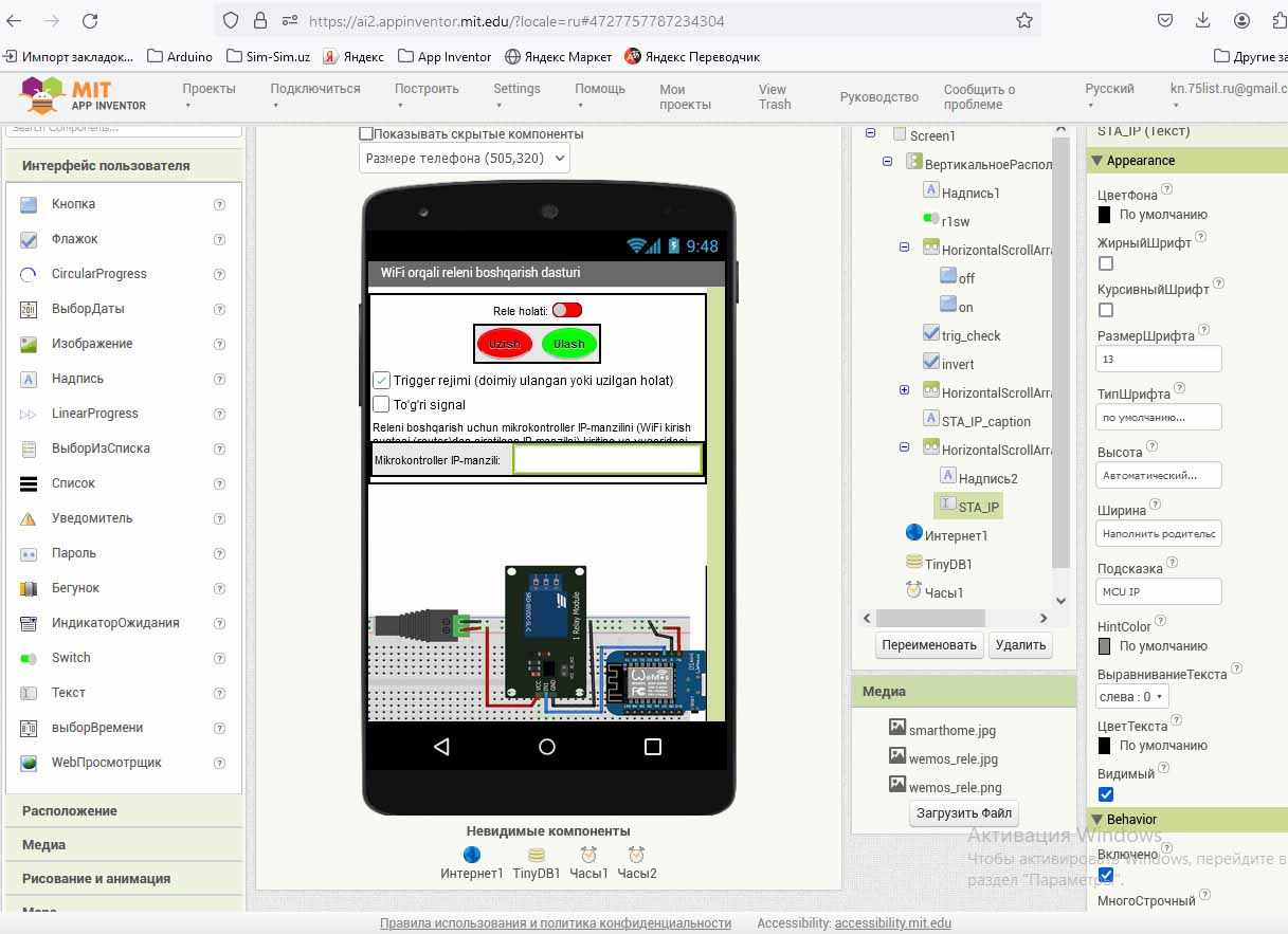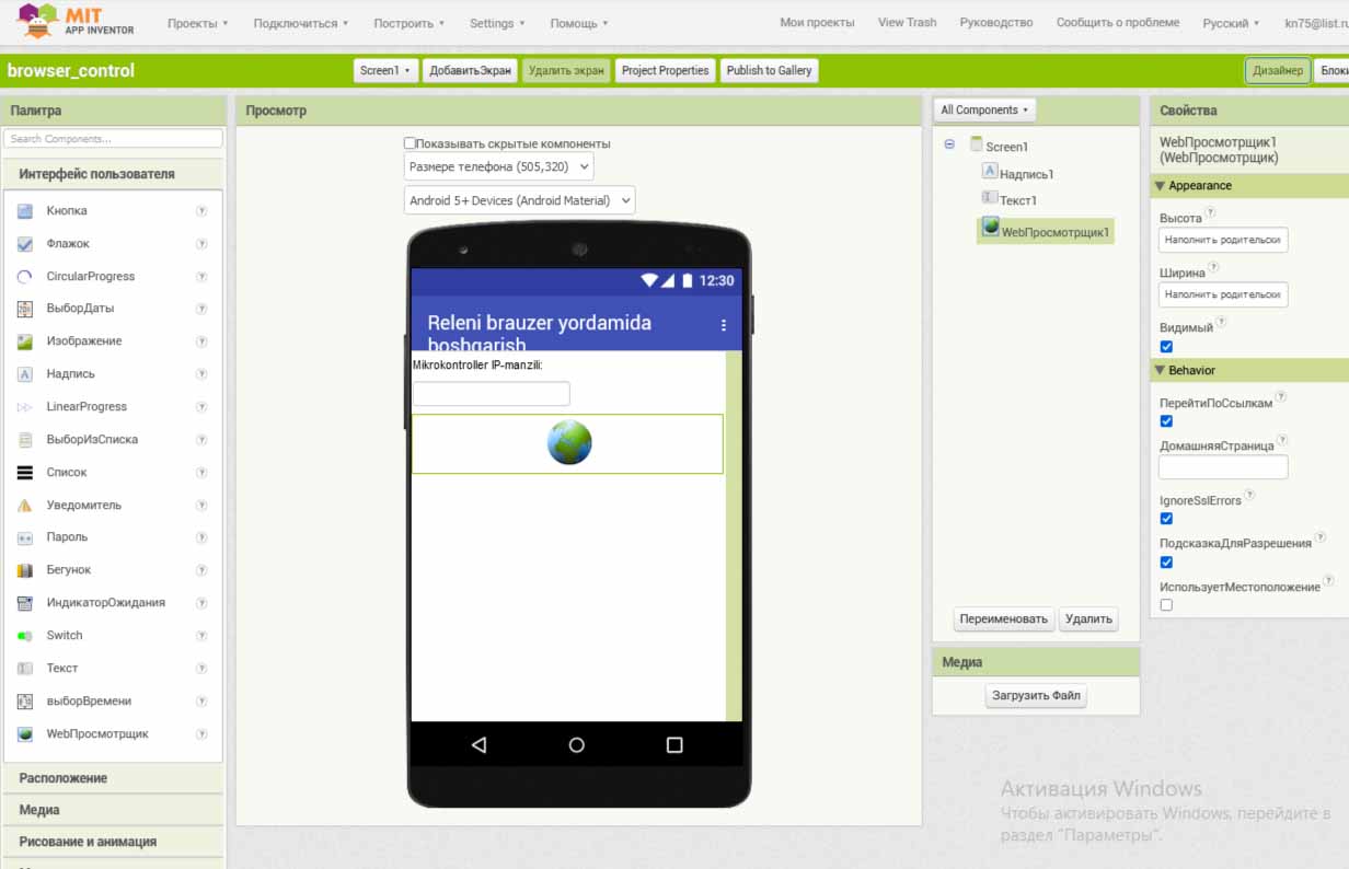 Buning uchun MIT AI da yangi “browser_control” nomli loyiha yaratamiz. “Project properties” tugmasi yordamida, yaratiladigan ilovamizga “WiFi rele” kabi tushunarli nom qo’yamiz. Loyiha oynasi ochilgach, smartfon sohasiga quyidagi 3 ta (“Надпись”, “Текст”, “WebПросмотрщик” turidagi) komponentlarni ko’rsatilgan tartibda joylashtiramiz (qulaylik uchun komponentlar soni imkon qadar minimallashtirilgan):