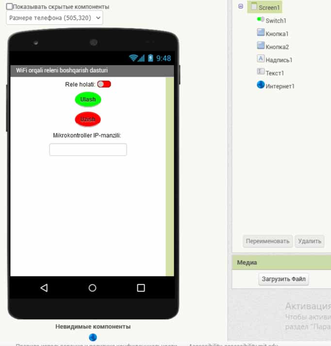 MIT AI da yangi “WiFi_relay” nomli loyiha yaratamiz. “Project properties” tugmasi yordamida, yaratiladigan ilovamizga “WiFi rele” kabi tushunarli nom qo’yamiz. Loyiha oynasi ochilgach, smartfon sohasiga quyidagi 6 ta (“Switch”, “Кнопка”, “Надпись”, “Текст”, “Интернет” turidagi) komponentlarni ko’rsatilgan tartibda joylashtiramiz (qulaylik uchun komponentlar soni imkon qadar minimallashtirilgan):