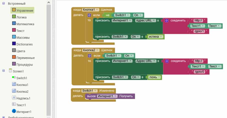 “когда Кнопка1.Щелчок” bloki “Кнопка1” (“Ulash”) tugmasi bosilganda qanday amallar bajarilishi zarurligini anglatadi. Uning ichidagi “если … то … ” bloki yordamida “Switch1” kalitining uzilgan holatidan kelib chiqib, http-so’rov shakllantiriladi. Ya’ni, agar “Кнопка1” tugmasi bosilgan paytda “Switch1” kaliti uzilgan holda bo’lsa, http-server uchun “http://IP-manzil/gpio/1” so’rovi shakllantiriladi. Bu yerda IP-manzil sifatida, “Текст1” matn maydonidagi yozuv qabul qilinadi. Shu bilan birga “Switch1” kalitining holati ulangan holga o’tkaziladi. Aksincha, ya’ni agar “Кнопка1” tugmasi bosilgan paytda “Switch1” kaliti ulangan holda bo’lsa, hech qanday amal bajarilmaydi.