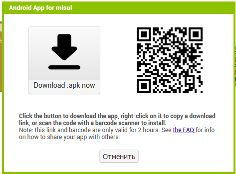 Agar hammasi to’g’ri bajarilgan bo’lsa, blokli dasturimizni kompilyatsiya qilish va uni apk formatli faylga sqalsh qoldi xolos. Buning uchun MIT AI ning “Построить” menyusidan “Android app (.apk)” elementini tanlaymiz. Taxminan 20-30 sekund ichida apk formatli fayl tayyor ekanligi bildiruvchi quyidagi kabi oyna paydo bo’ladi:
