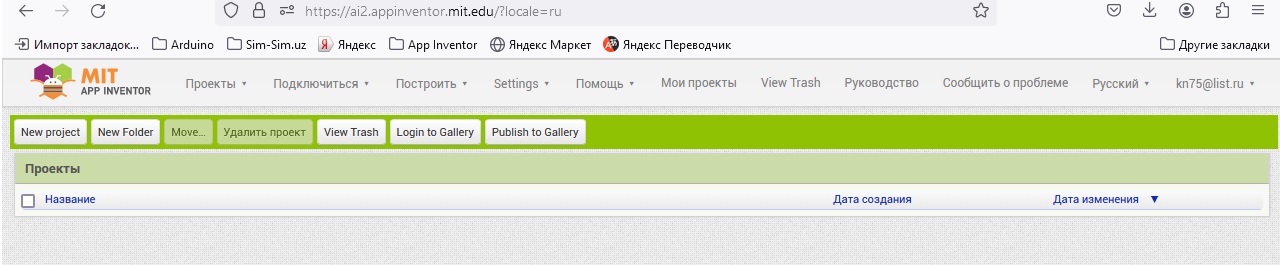 Akkauntga tez o’tish uchun “Create Apps!” tugmasi bosiladi va keyingi sahifada Google akkaunti ma’lumotlari (login, parol) kiritiladi. Ber nechta yordamchi dialog oynalari o’tkazib yuborilganidan so’ng, oynada quyidagi asosiy sahifa paydo bo’ladi. MIT AI ga birinchi marta kirilganda, tabiiyki, ro’yxat bo’sh bo’ladi. Bundan tashqari, akkauntga birinchi marta kirilganda, dastur ma’lumotlari ingliz tilida ko’rsatiladi, foydalanuvchi o’ziga kerakli tilni sahifaning yuqori o’ng tomonidagi menyudan tanlab olishi tavsiya etiladi. Biz dasturning rus tilidagi variantidan foydalanamiz.