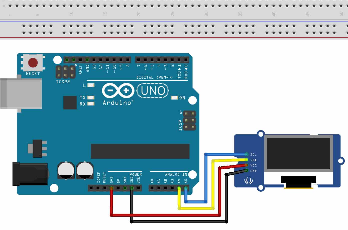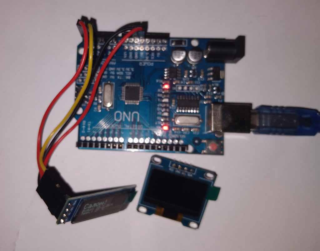 SSD1306 displeyining SDA va SCL pinlari mikrokontrollerlarning xuddi shunday nomli (AREF yonidagi) pinlariga yokiga quyidagicha ulanadi: