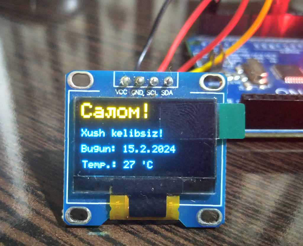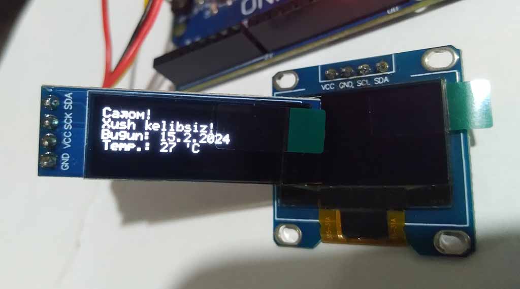 Ko’rinib turibdiki, SSD1306 OLED displeyining yuqoridagilardan boshqa o’lchamli variantidan foydalanilsa, sketchga tegishli o’zgartirishlar kiritilishi zarur.