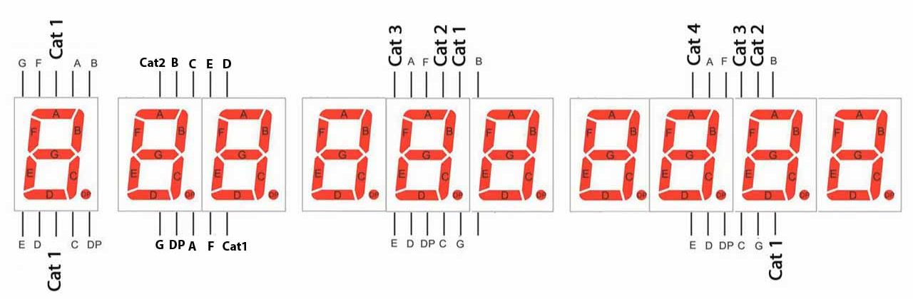 7 ta segmentli indikatorlarning 2 ta va undan ortiq razryadli variantlari bilan ishlash 1 ta razryadli indikatornikidan farq qiladi. Yuqoridagi rasmlardan ko’rish mumkinki, barcha razryadlardagi segmentlar kontaktlari bir-biriga parallel ulangan, har bir razryadni faollashtirish uchun alohida kontakt – umumiy katod yoki umumiy anod kontaktlari ishlatiladi.