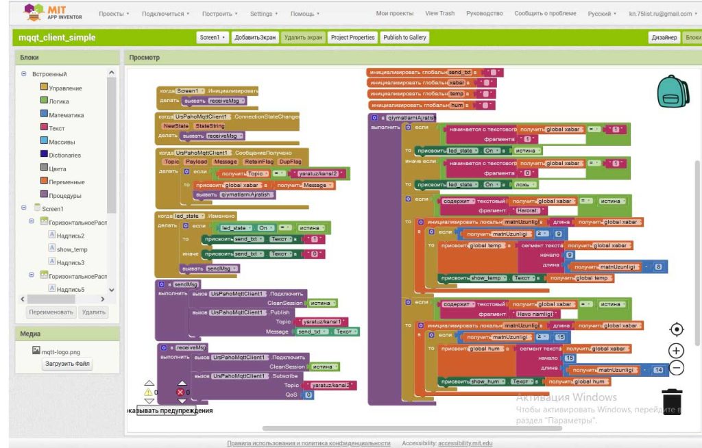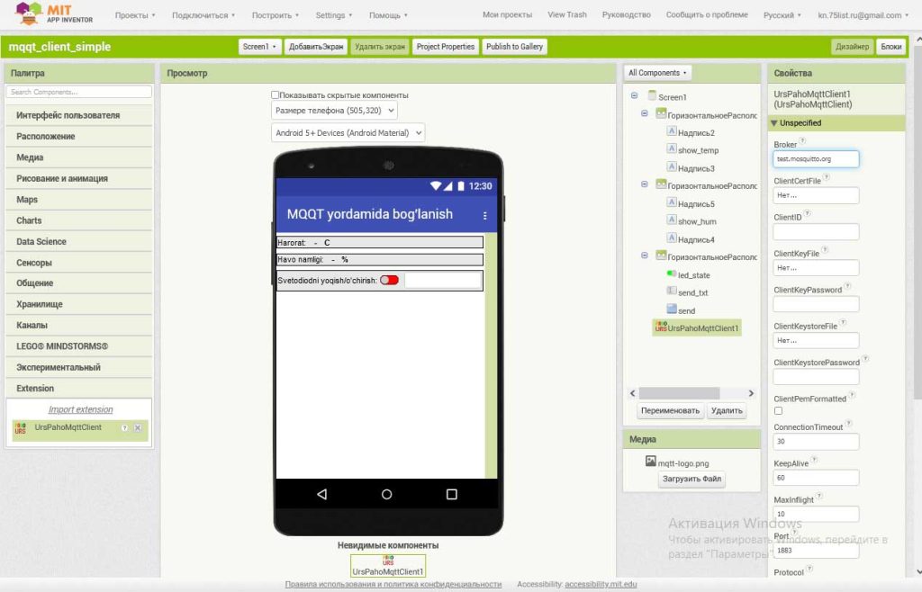 O’zimiz Mit App Inventor vositasi yordamida yaratadigan mobil ilova tashqi ko’rinishi va blokli kodi quyidagicha bo’ladi (Mit App Inventorda MQQT-brokerlar bilan ishlash bo’yicha ichki vosita va bloklar mavjud bo’lmaganligi sababli, Internetdan “UrsPahoMqqtClient” nomli tashqi kengaytmani yuklab, qo’shib olamiz. Kengaytma dastur oynasining chap tomonidagi “Extension” bo’limiga qo’shiladi):