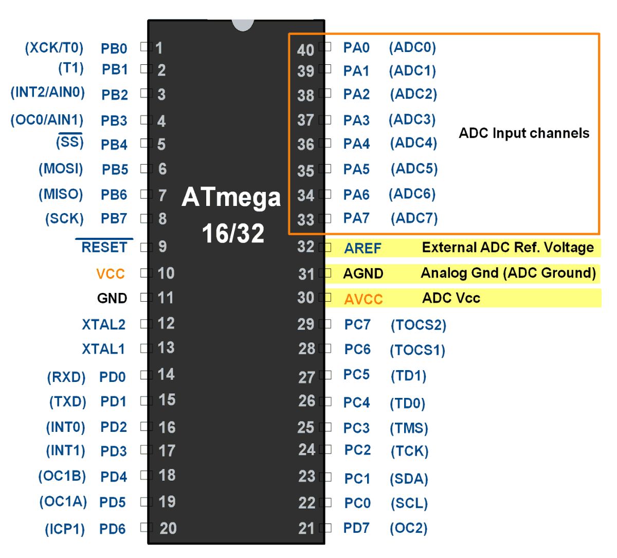 - ADC (Analog-Digital Converter, Analog-raqamli Konverteri, “Аналого-Цифровой Преобразователь”, “АЦП”) – yuborilgan signal kuchlanishini, analog signal darajasini o’lchash va uni raqamlashtirish bloki. Bunday imkoniyatga ega bo’lgan pinlar analog pinlar deb ataladi.