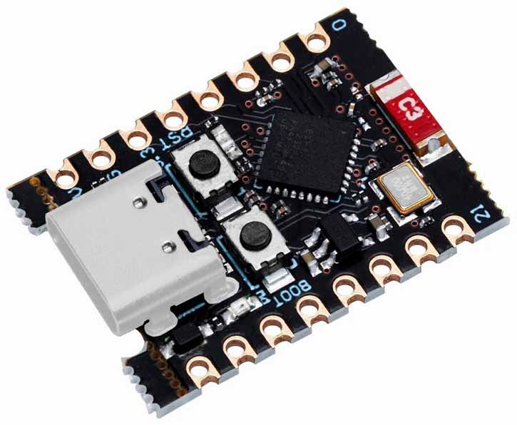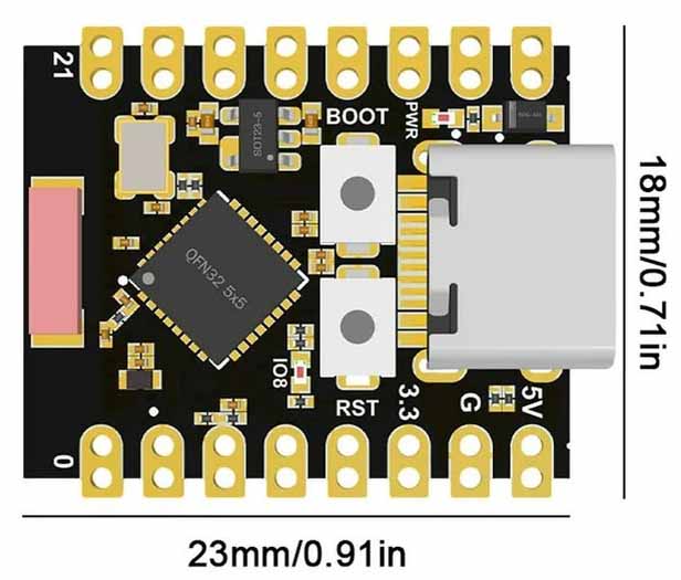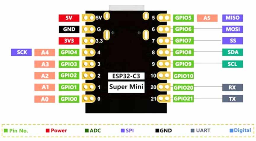 ESP32C asosidagi ESP32C3 Super Mini energiyatejamkor moduli ushbu oilaning eng kichik o’lchamli vakillaridan biri hisoblanadi. Shuning uchun uning GPIO pinlari soni ham atigi 13 tani (0-10, 20 – RxD, 21 – TxD) tashkil etadi. Shundan 6 tasi (0-5) analog kirish rejimida ham ishlatilishi mumkin. Qolgan 3 ta kontaktlar esa elektr iste’moli (GND, +3,3V, +5V) uchun ajratilgan. Ichki svetodiod 8-pinga ulangan.