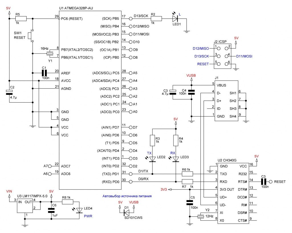 Bundan tashqari unda 3 ta GND (0V), 2 ta +5V (stabilizator 1-chiqishi), 1 ta +3,3V (stabilizator 2-chiqishi), 1 ta Vin (+5-12V stabilizator kirishi), RES (qayta yuklash), AREF (Analog Reference – tashqi stabillashgan etalon kuchlanish uchun kirish pini), SDA, SCL (SDA, SCL pinlari xususiyatlari yuqorida izohlangan) pinlari, 1 ta USB mini porti, DC in (o’zgarmas kuchlanishli ta’minot bloki), Reset knopkasi, TX va RX ichki indikator-svetodiodlari, 1 ta ichki dasturiy svetodiod (foydalanuvchi boshqarishi mumkin, raqamli 13-pinga parallel ulangan), +5V va +3,3V ichki stabilizatorlari, UART (yuqorida izohlangan), ichki programmator ham mavjud. UNO boshqa platalardan pinlar soni va boshqa xususiyatlari bilan farq qiladi.