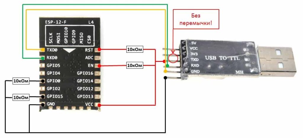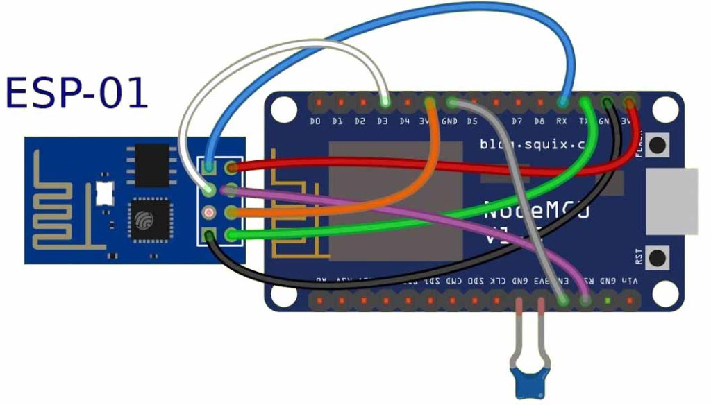 ESP-01 moduliga sketchni ko’chirish (proshivka qilish uchun) maxsus programmatordan foydalanish mumkin. Bunda, modulga sketchni yuklash (boot) rejimini faollashtirish uchun programmator chiqish portidagi “IO0” (0, GPIO0) va “GND” yozuvli kontaktlarini qisqa muddatga tutashtirish kerak bo’ladi. Sketch yuklab bo’linganidan keyin, dasturni ishga tushirish uchun esa, “RST” va “GND” yozuvli kontaktlar qisqa muddatga tutashtiriladi.