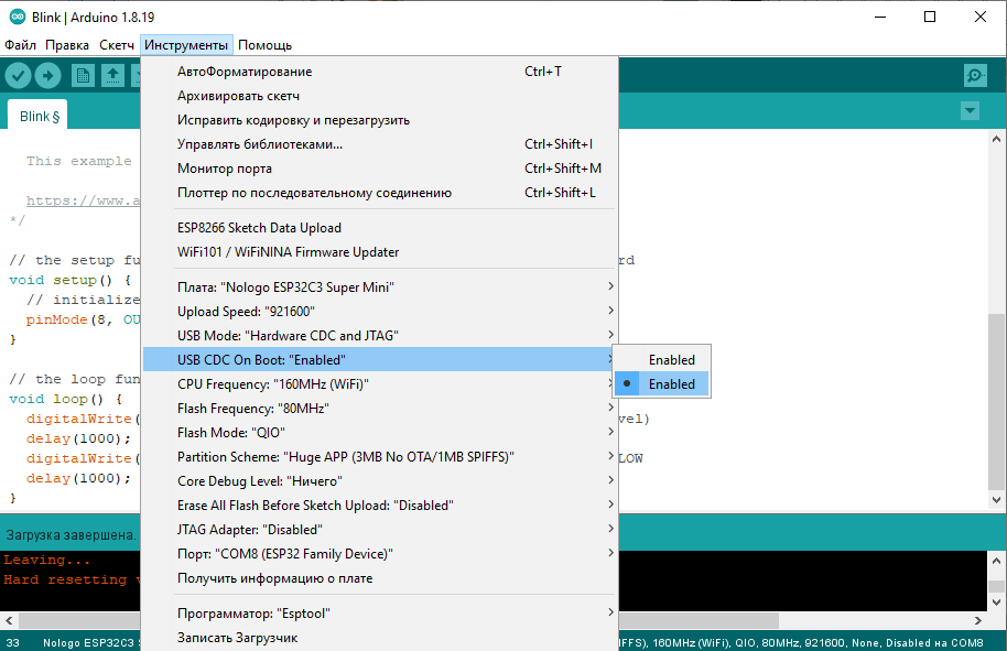 Odatda, yangi platalar oilasi yuqoridagi ro’yxatga qo’shilganidan so’ng, “Инструменты\Плата” menyusida tegishli platalar nomlarini o’z ichiga olgan yangi ichki menyular (“ESP8266 boards…”, “ESP32 Arduino”) paydo bo’ladi. Bundan tashqari, “Инструменты” menyusidagi “Менеджер библиотек” ro’yxatida yangi qo’shilgan platalarga tegishli qo’shimcha bibliotekalar nomlari ham paydo bo’ladi. Zaruratga qarab, ular alohida o’rnatiladi (asosiy bibliotekalar platani o’rnatish paytida o’rnatiladi). Shuningdek, tegishli plata tanlanganidan so’ng, “Файл\Примеры” menyusida yangi plata bilan ishlashga doir yangi namunaviy sketchlarni o’z ichiga oluvchi bo’limlar ham paydo bo’ladi.