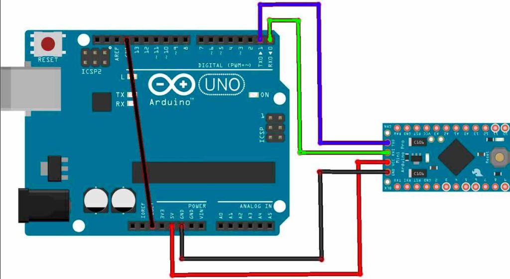 USB-TTL konverter bo’lmagan vaziyatlarda esa, proshivkani mikrokontrollerga yozish uchun, ichki programmatorga ega bo’lgan boshqa platadan ham foydalanish mumkin. Lekin bunda mikrokontrollerlarning TX va RX pinlari aynan bir xil, ya’ni TX dan TX ga va RX dan RX ga bog’lanishi kerak! Chunki, bu yerda faqat proshivkalovchi plataning ichki programmatoridan foydalaniladi, mikrokontroller esa, hech qanday rol o’ynamaydi.