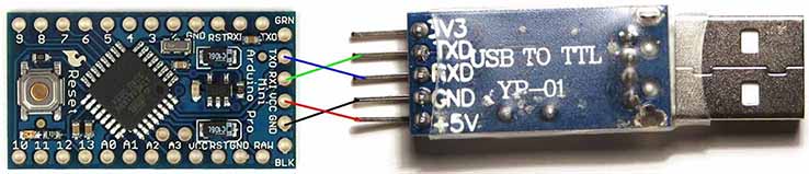 Lekin, ichki programmatorga ega bo’lmagan plata va modullarga dasturni yuklashda tashqi programmatorlar – USB-TTL konverterlardandan foydalanishga to’g’ri keladi. Bunda konverterning TX (“transmit”, “uzatish”) va RX (“receive”, “qabul qilish”) pinlari mos ravishda mikrokontrollerning RX va TX pinlariga, ya’ni konverterning uzatish pini mikrokontrollerning qabul qiluvchi piniga va aksincha, konverterning qabul qilish pini mikrokontrollerning uzatish piniga bog’lanishi kerak bo’ladi.