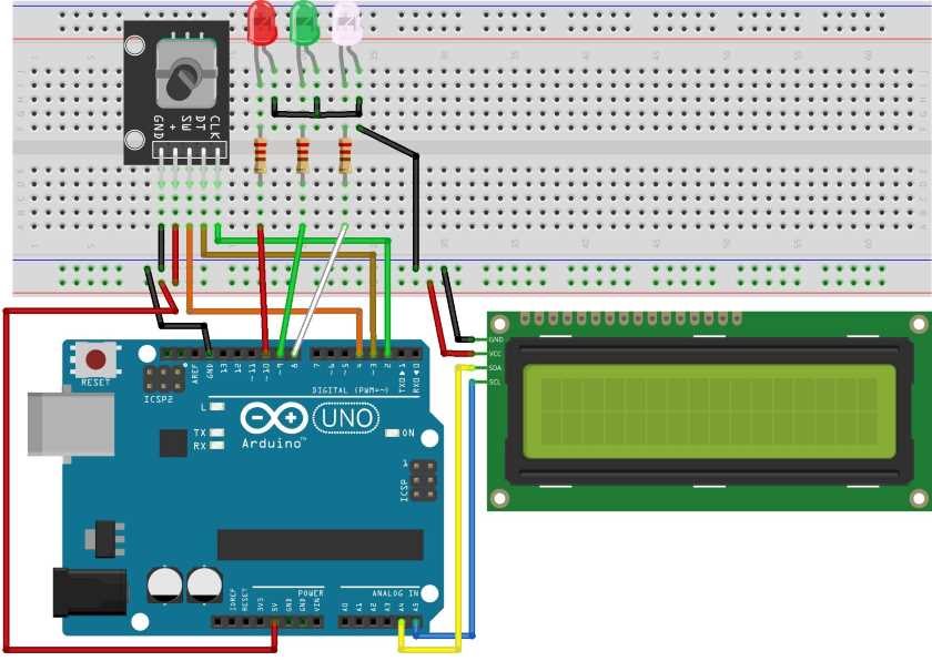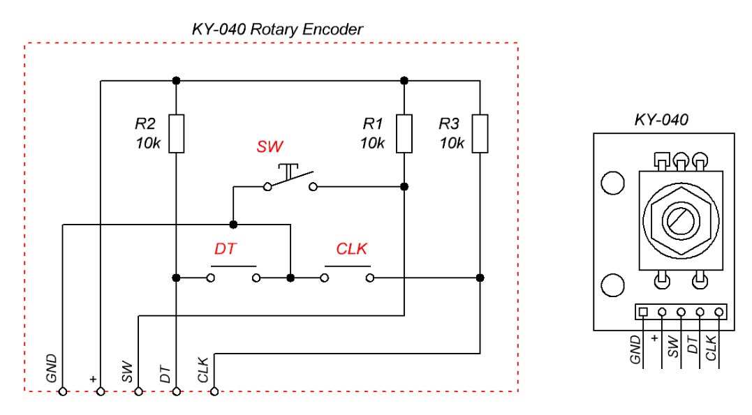 Oxirgi rasmdan ko’rinib turibdiki, enkoder 2 ta ichki pereklyuchatel va 1 ta tugmaning ma’lum bir sxema asosida bog’lanishi hisoblanadi. Shuning uchun uni oddiy raqamli datchilarning yana bir turi deb hisoblash mumkin. Har bir pereklyuchatel va tugma 10 kOm li rezistor bilan musbatga tortib qo’yilgan. Demak, ular dastlab HIGH signali holatida bo’ladi. Pereklyuchatel ulanganda (enkoder muruvvati buralganda) va tugma bosilganda esa, ularning chiqishida LOW signali hosil bo’ladi.