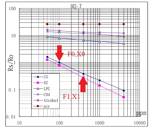 2-misol. Ushbu misolda tashqi faktorlarni hisobga olgan holda datchik ko’rsatkichlari nisbatan aniqlashtirilishi mumkin. Sketchdagi R2 rezistori qarshiligi datchikdagi R2 rezistori qarshiligini bildiradi. R0 qiymati tajriba yo’li bilan toza havoli hududda o’lchangan datchik ichki qarshiligi ko’rsatkichni bildiradi. Rs qiymati – o’lchov bajariladigan hududda o’lchangan datchik ichki qarshiligi ko’rsatkichi hsob-kitob yo’li bilan aniqlanadi. RS va R0 qiymatlari asosida maxsus formulalar yordamida hududdagi gaz (CO) konsentratsiyasi (PPM) aniqlanadi.