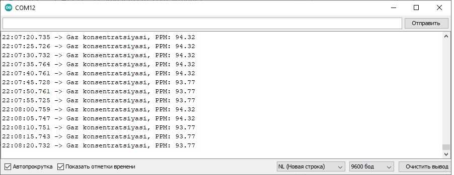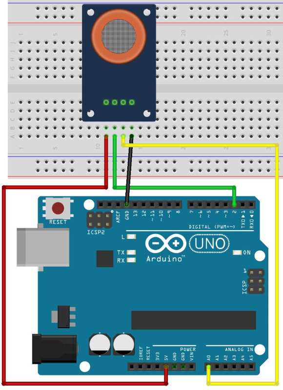 1-misol. MQ-2 datchigi yordamida tutun va uglevodorod gazlari konsentratsiyasini aniqlashning soddalashtirilgan sketchini ko’rib chiqamiz (bunda havo harorati, namligi va boshqa faktorlar hisobga olinmaydi, shuning uchun aniqlik darajasi past bo’ladi).