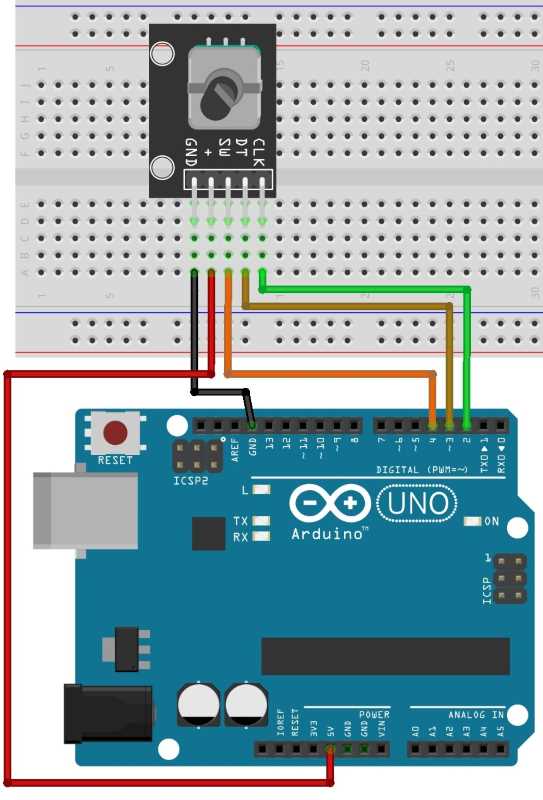 1-misol. Ushbu misolda inkremental enkoderning ishlash prinsipini ko’rsatuvchi oddiy sketchni ko’ramiz. Uning asosida turli Arduino loyihalarida raqamli regulyatorlar yaratish mumkin (Masalan, displeylar uchun menyularni – bunda enkoder muruvvatini burash orqali displeydagi menyu bo’limlarini tanlash, tugma yordamida ularga o’tish mumkin).