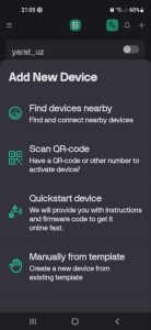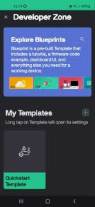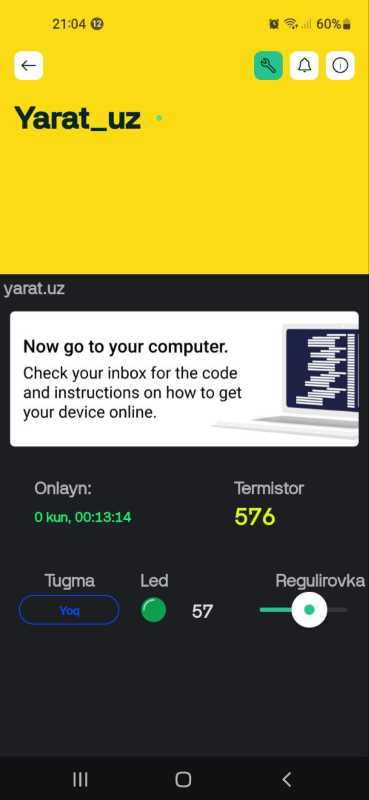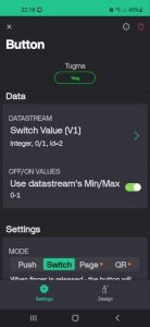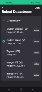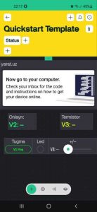 Buning uchun mobil ilovada yangi shablon, uning ichida yangi vidjet, unda esa V1 (Tugma yordamida svetodiodni boshqarish uchun), V2 (onlayn vaqtini ko’rsatish uchun), V3 (Termistor ko’rsatkichlari uchun), V4 (svetodiod yorug’ligini regulirovka qilish uchun) virtual pinlarini yaratamiz, ularning joylashuvi va boshqa xususiyatlarini sozlaymiz.