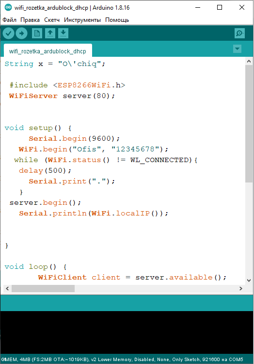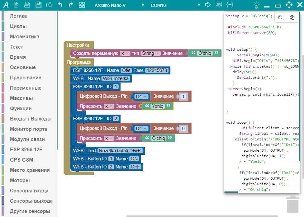 Kod yozmasdan WiFi-rozetka dasturini tuzish uchun, ArduBlock dasturini ishga tushiramiz. Kerakli bloklarni quyidagi tartibda asosiy oynaga joylashtiramiz: