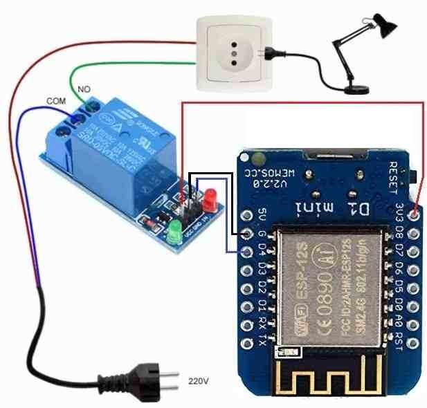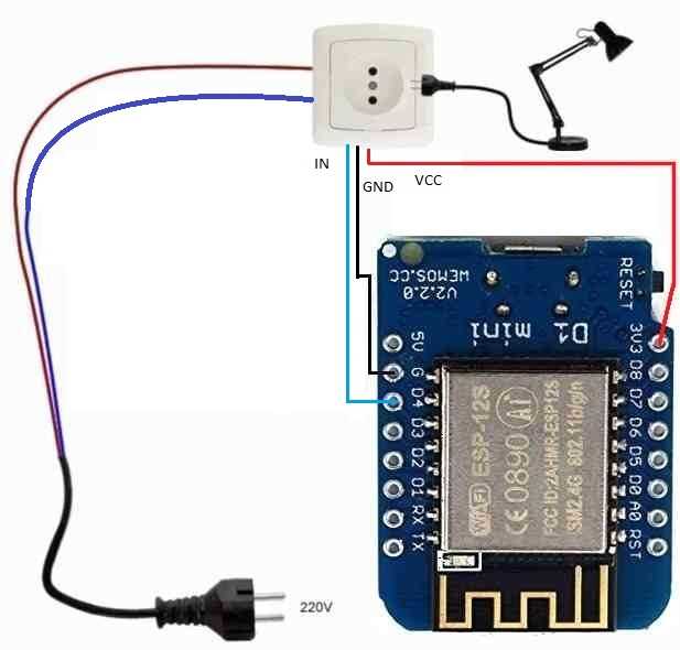 Maket platasiga Wemos D1 mini platasini joylashtiramiz va oʻtkazgichlar yordamida rele moduliga bogʻlaymiz. Wemos D1 mini platasining 3V3, G, D4 kontaktlarini topamiz, ularni oʻtkazgichlar yordamida mos ravishda (sxemada qizil, qora, koʻk ranglarda) rele modulidagi VCC, GND, IN kontaktlariga ulaymiz (baʻzi rele modullaridagi kontaktlar joylashuvi sxemadan farq qilishi mumkin, lekin ulardagi kontaktlarning nomlanishi oʻxshash boʻladi: VCC, IN1, GND). WiFi-rozetka qurilmasining bogʻlanish sxemasi quyidagi holga keladi: ,