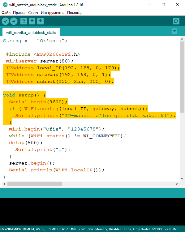 Yuqoridagi kod varianti umuman kodsiz dasturlash maqsadida yaratildi. Lekin, ushbu dastur orqali koʻrsatiladigan WiFi-rozetka IP-manzili WiFi-routerdagi DHCP-server tomonidan ajratilgan boʻlsa, u kelgusida oʻzgarib turishi mumkin, natijada boshqaruvchi dasturlarda yoki brauzerlarda har safar oʻzgargan IP-manzilni qayta koʻrsatishga toʻgʻri keladi. Muammoni bartaraf etish uchun, IP manzilni aniq koʻrsatib qoʻyish kerak boʻladi.