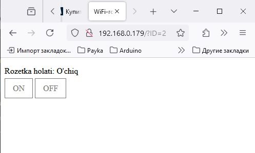 Agar IP-manzil toʻgʻri koʻrsatilgan boʻlsa, ochilgan veb-sahifada WiFi-rozetkaning oxirgi holati va “ON”, “OFF” boshqaruv tugmalari koʻrsatiladi. Tugmalar yordamida WiFi-rozetka yuklamasini boshqarish mumkin, boshqarish natijasi matn yordamida ham ko’rsatib turiladi. Har bir boshqaruv buyrug’idan keyin, brauzer manzillar qatoridagi manzil ham oʻzgarib turadi. Manzil oxiridagi “ID=1” yozuvi yuklama ulanganligini, “ID=2” esa, uzilganligini bildiradi. Shu manzillarni qoʻlda oʻzgartirish orqali ham yuklamani brauzer yordamida boshqarish mumkin.