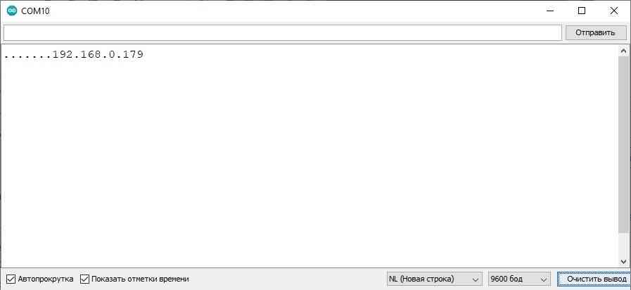 Agar hammasi toʻgʻri bajarilgan boʻlsa, dastur ishga tushgan paytda u koʻrsatilgan SSID va parol asosida WiFi tarmogʻiga ulanishga urinadi. Ulanish muvaffaqiyatli bajarilsa, oxirida port monitorida mikrokontroller IP-manzili koʻrsatiladi. Shuning uchun, yuklash jarayoni tugagan zahoti Arduino IDE oynasi yuqori oʻng tomonidagi tugma yordamida port monitorini ochish kerak boʻladi. Agar uni koʻrishga ulgurmagan boʻlsangiz, platadagi “reset” tugmasi yordamida dasturni qayta ishga tushirishingiz mumkin.