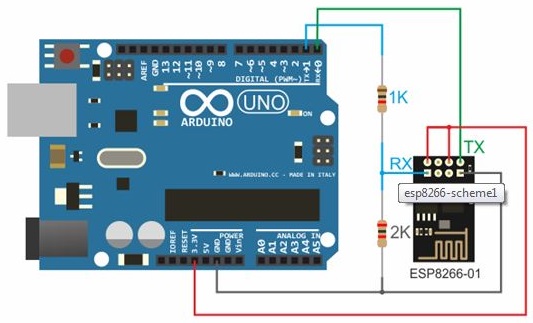 Oxirgi 2 ta rezistorlar “kuchlanishni bo’lgich” rolini bajaradi. Natijada, Arduino UNO TX pinidan chiquvchi kuchlanish maksimal qiymati 5V dan 3,3V gacha pasayadi va ESP01 moduli RX pinining ishdan chiqish ehtimoli yo’qoladi.