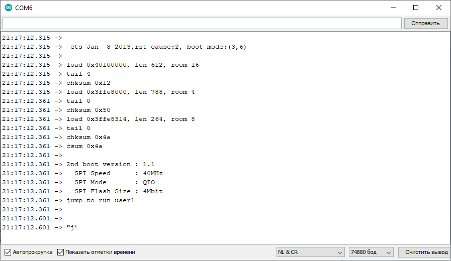 Proshivka dastlab ishga tushirilganda port ma’lumot almashish tezligi 74880 bodga o’tkazib olinsa, dastlabki ma’lumotni o’qish mumkin.